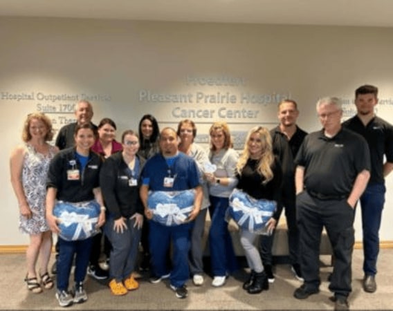 June 18th was a rainy day in Kenosha, Wisconsin, but the team of employees from Zeigler Subaru of Kenosha delivered beautiful, soft blankets, patient care kits and messages of hope, which in turn created smiles for the patients of Froedtert South Cancer Center. Zeigler Subaru has been a friend of Froedtert South Cancer Center for years, and their appreciation for each other is evident. The delivery team was delighted to hand blankets and patient care kits to several patients as they received their infusions.